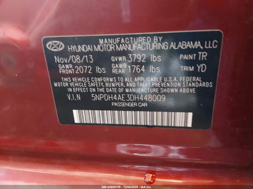 2013 HYUNDAI ELANTRA 2013 року Бензин, 1.8, Передний привод, vin - 5NPDH4AE3DH448009 из США