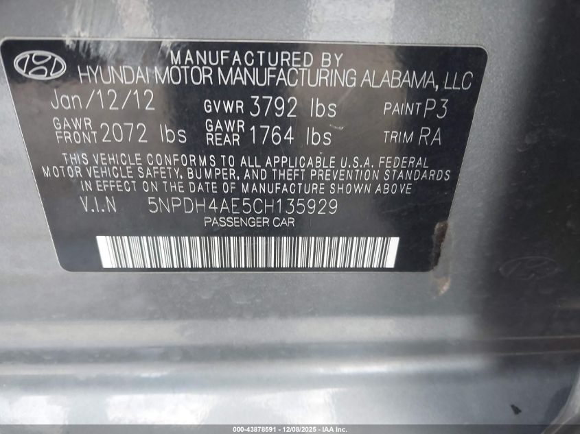2012 HYUNDAI ELANTRA 2012 року Бензин, 1.8, Передний привод, vin - 5NPDH4AE5CH135929 из США