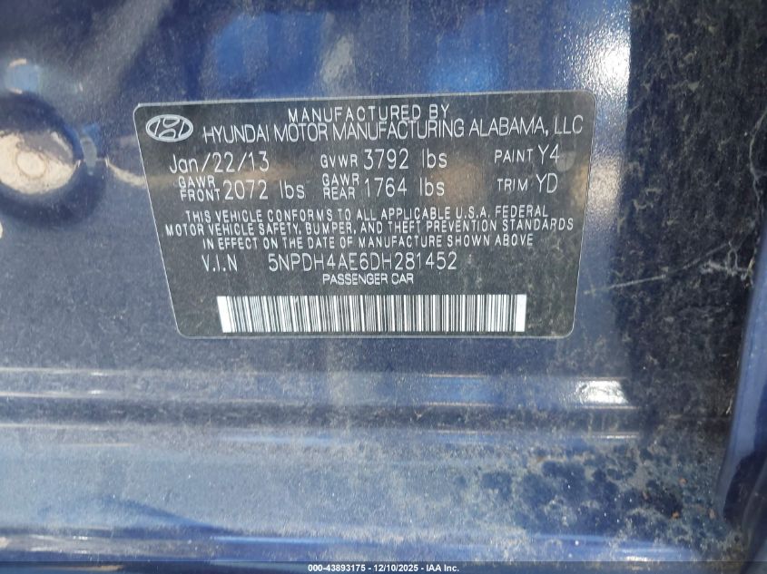 2013 HYUNDAI ELANTRA 2013 року Бензин, 1.8, Передний привод, vin - 5NPDH4AE6DH281452 из США
