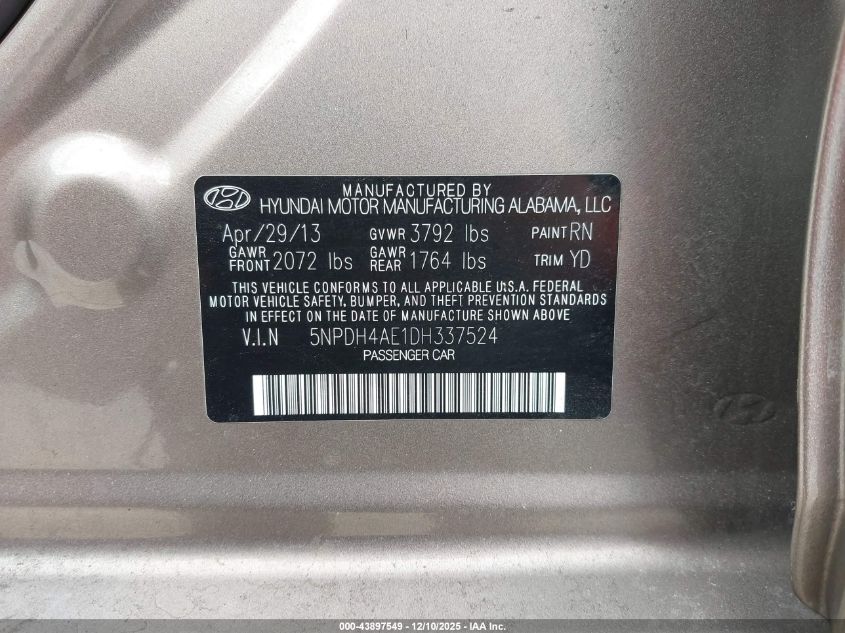 2013 HYUNDAI ELANTRA 2013 року Бензин, 1.8, Передний привод, vin - 5NPDH4AE1DH337524 из США
