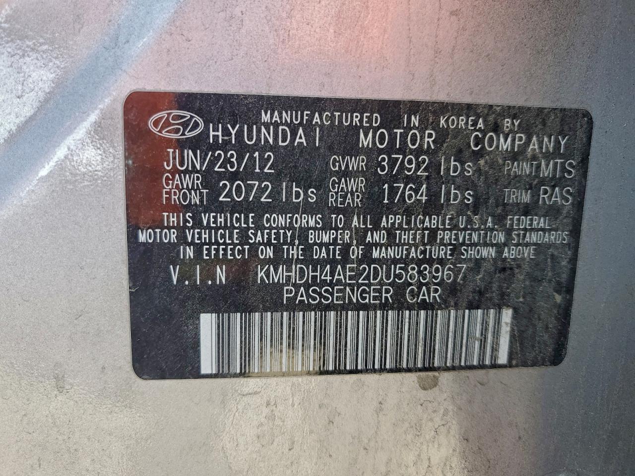 2013 HYUNDAI ELANTRA 2013 року Бензин, 1.8, , vin - KMHDH4AE2DU583967 из США