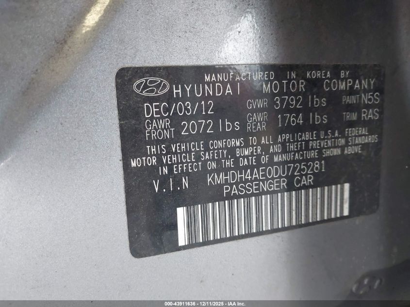 2013 HYUNDAI ELANTRA 2013 року Бензин, 1.8, Передний привод, vin - KMHDH4AE0DU725281 из США