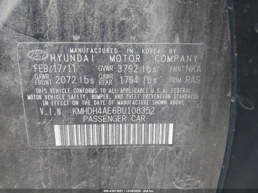 2011 HYUNDAI ELANTRA 2011 року Бензин, 1.8, Передний привод, vin - KMHDH4AE6BU108352 из США