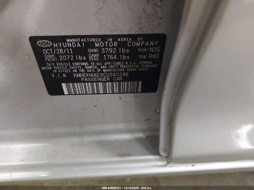 2012 HYUNDAI ELANTRA 2012 року Бензин, 1.8, Передний привод, vin - KMHDH4AEXCU345296 из США