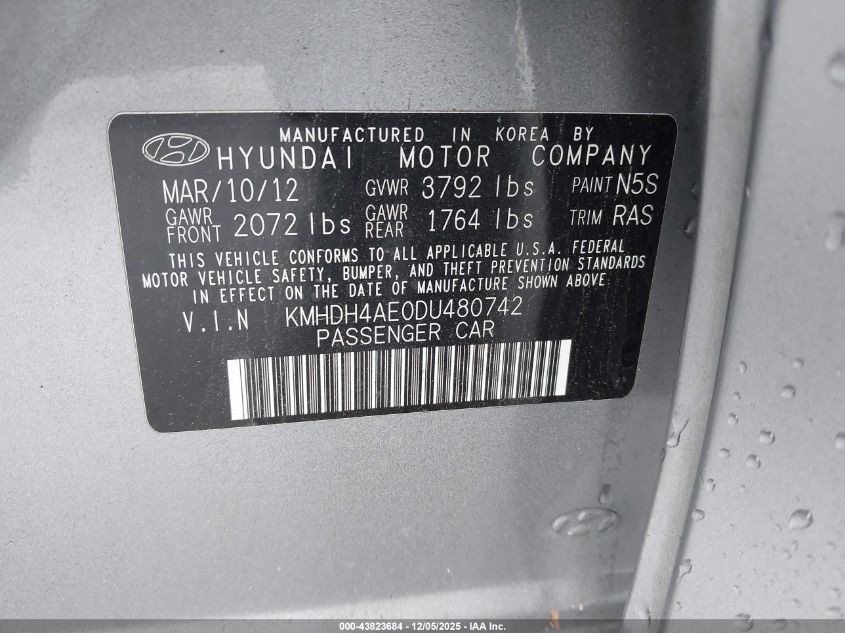 2013 HYUNDAI ELANTRA 2013 року Бензин, 1.8, Передний привод, vin - KMHDH4AE0DU480742 из США