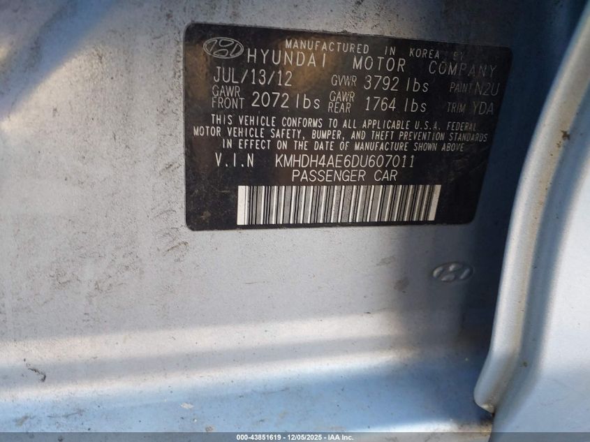 2013 HYUNDAI ELANTRA 2013 року Бензин, 1.8, Передний привод, vin - KMHDH4AE6DU607011 из США