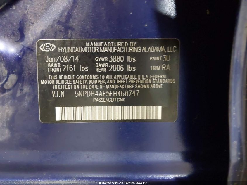 2014 HYUNDAI ELANTRA 2014 року Бензин, 1.8, Передний привод, vin - 5NPDH4AE5EH468747 из США