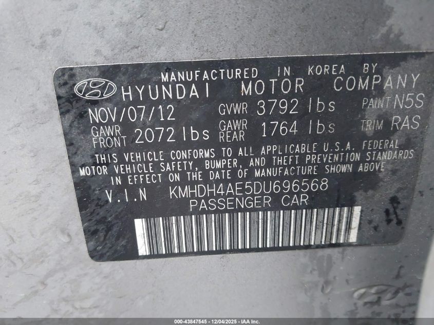 2013 HYUNDAI ELANTRA 2013 року Бензин, 1.8, Передний привод, vin - KMHDH4AE5DU696568 из США