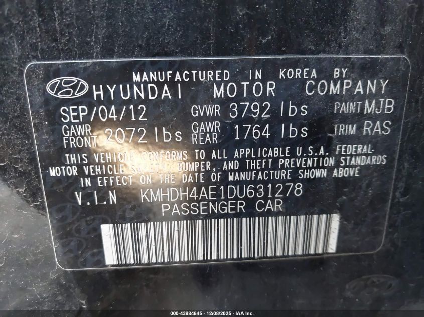2013 HYUNDAI ELANTRA 2013 року Бензин, 1.8, Передний привод, vin - KMHDH4AE1DU631278 из США