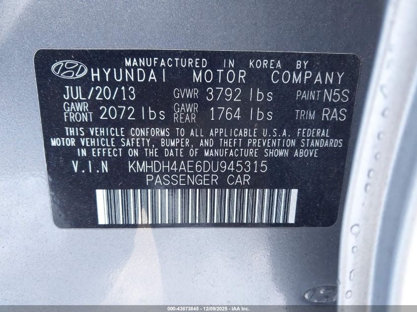 2013 HYUNDAI ELANTRA 2013 року Бензин, 1.8, Передний привод, vin - KMHDH4AE6DU945315 из США