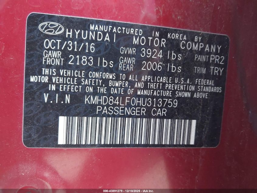 2017 HYUNDAI ELANTRA 2017 року Бензин, 2.0, Передний привод, vin - KMHD84LF0HU313759 из США
