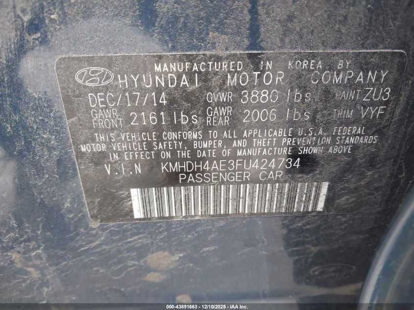 2015 HYUNDAI ELANTRA 2015 року Бензин, 1.8, Передний привод, vin - KMHDH4AE3FU424734 из США