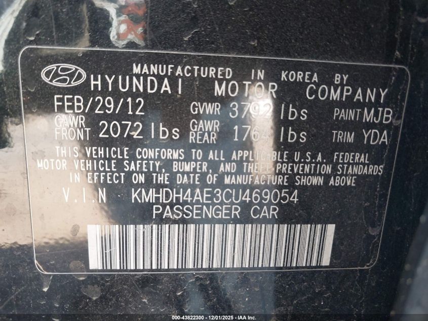 2012 HYUNDAI ELANTRA 2012 року Бензин, 1.8, Передний привод, vin - KMHDH4AE3CU469054 из США