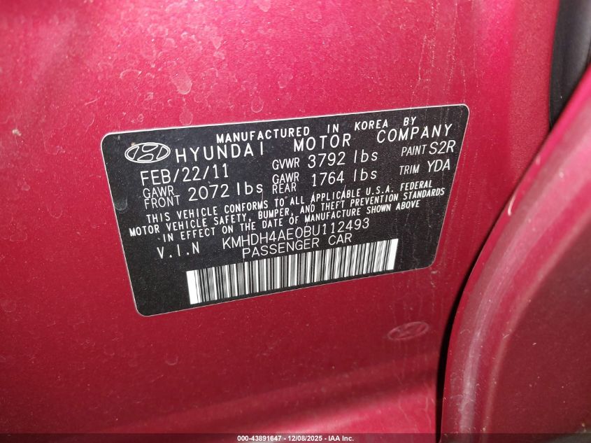 2011 HYUNDAI ELANTRA 2011 року Бензин, 1.8, Передний привод, vin - KMHDH4AE0BU112493 из США