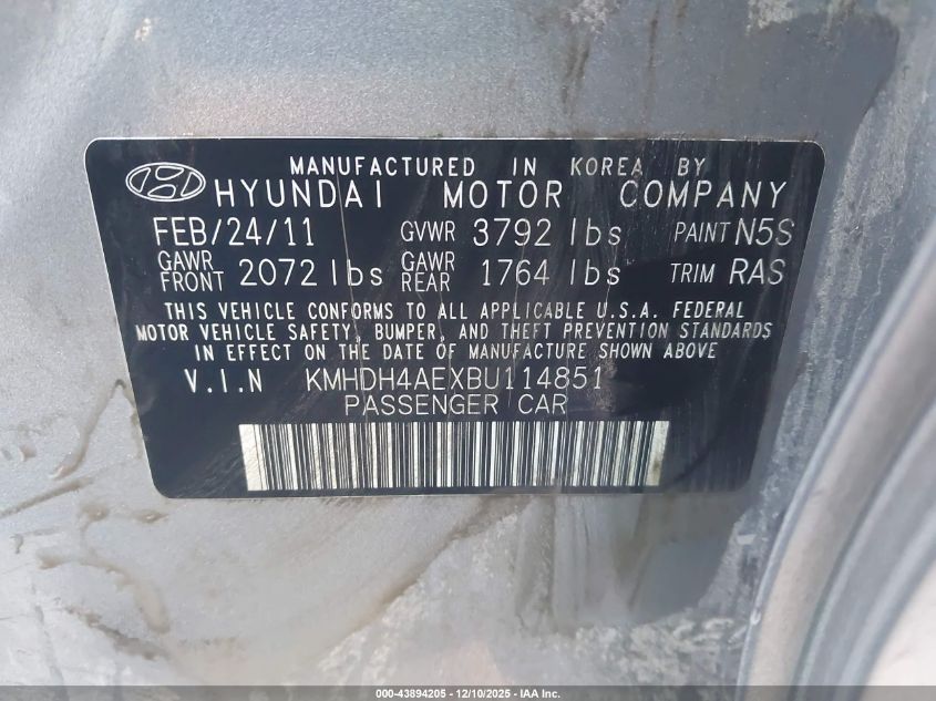 2011 HYUNDAI ELANTRA 2011 року Бензин, 1.8, Передний привод, vin - KMHDH4AEXBU114851 из США