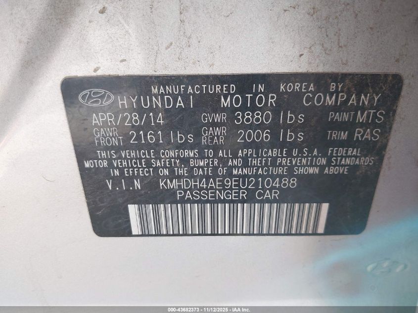 2014 HYUNDAI ELANTRA 2014 року Бензин, 1.8, Передний привод, vin - KMHDH4AE9EU210488 из США