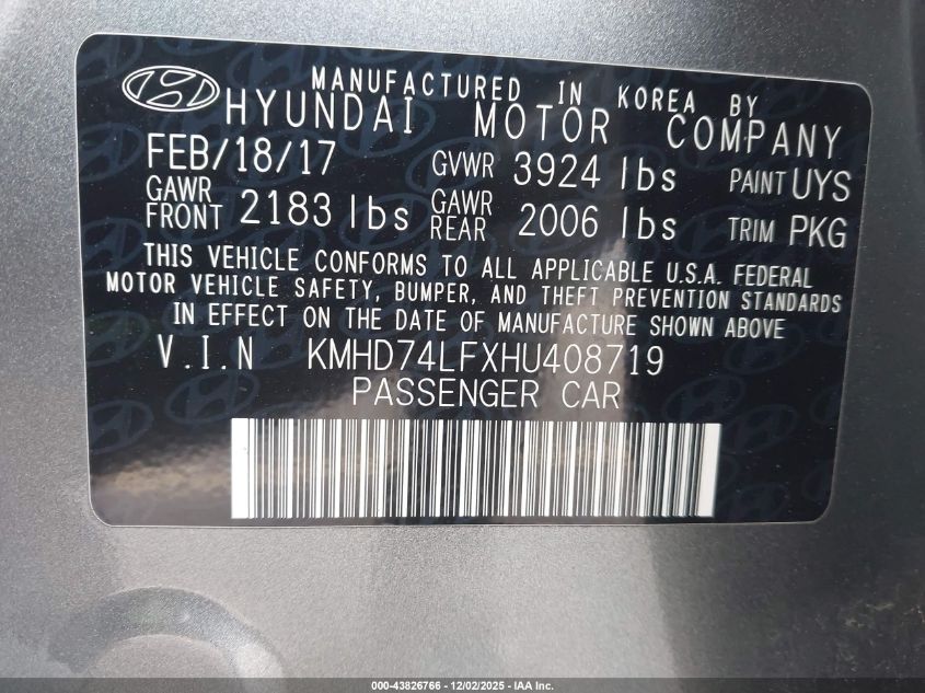 2017 HYUNDAI ELANTRA 2017 року Бензин, 2.0, Передний привод, vin - KMHD74LFXHU408719 из США
