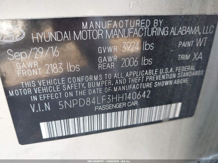 2017 HYUNDAI ELANTRA 2017 року Бензин, 2.0, Передний привод, vin - 5NPD84LF3HH140642 из США