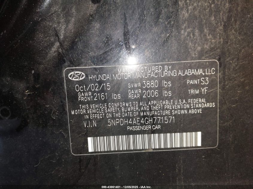 2016 HYUNDAI ELANTRA 2016 року Бензин, 1.8, Передний привод, vin - 5NPDH4AE4GH771571 из США