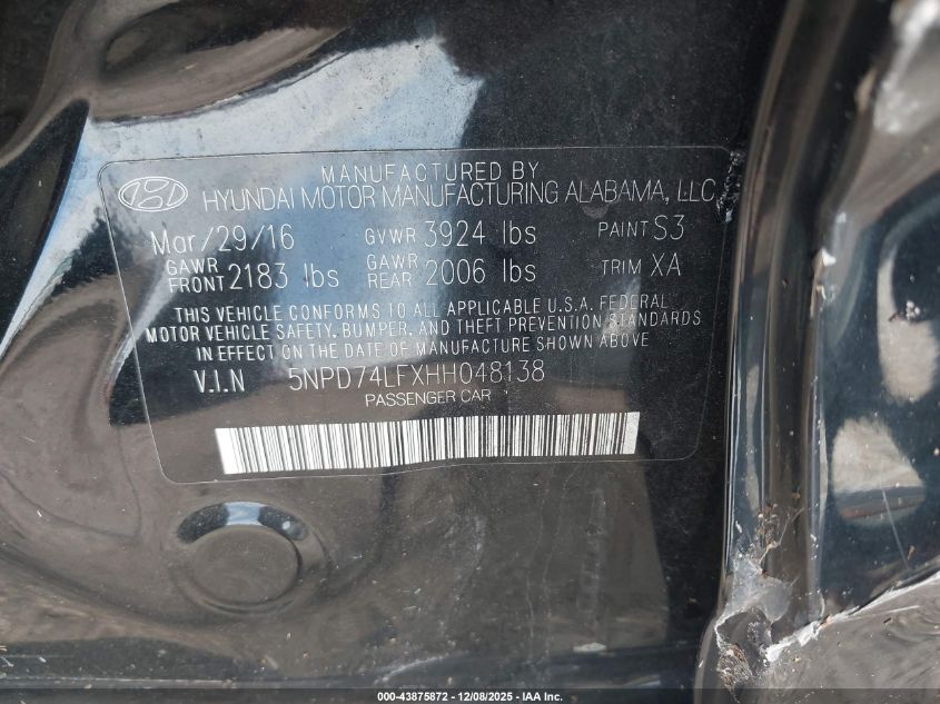 2017 HYUNDAI ELANTRA 2017 року Бензин, 2.0, Передний привод, vin - 5NPD74LFXHH048138 из США