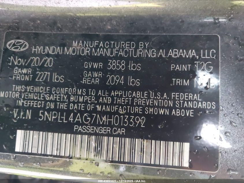 2021 HYUNDAI ELANTRA 2021 року Бензин, 2.0, Передний привод, vin - 5NPLL4AG7MH013392 из США