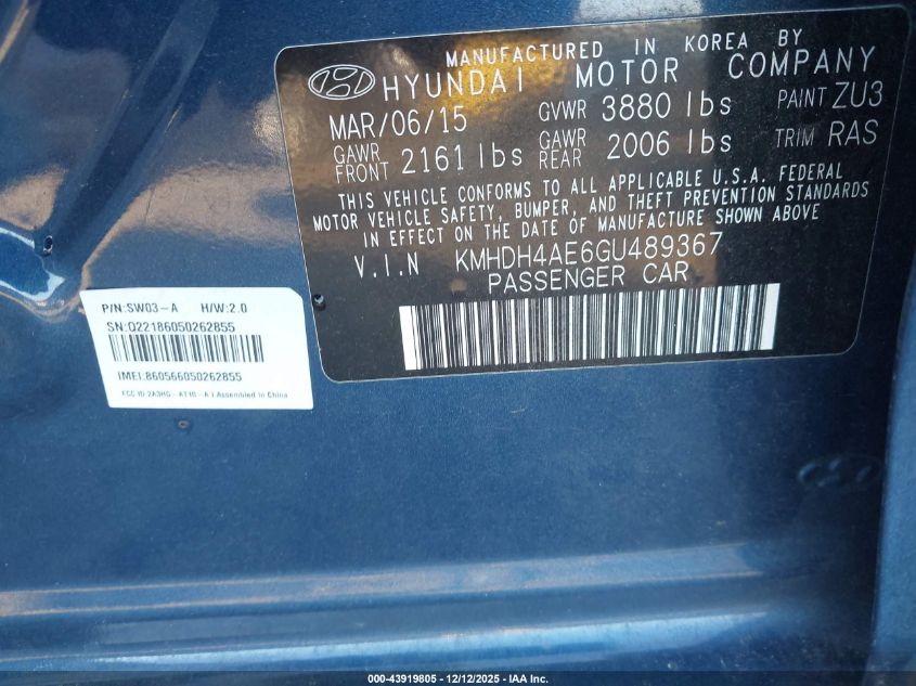 2016 HYUNDAI ELANTRA 2016 року Бензин, 1.8, Передний привод, vin - KMHDH4AE6GU489367 из США