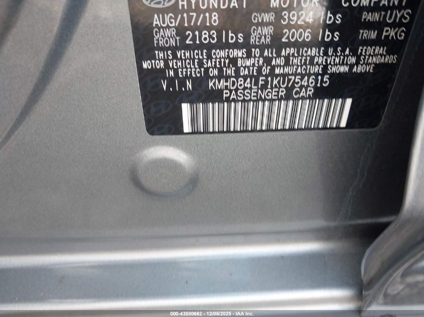 2019 HYUNDAI ELANTRA 2019 року Бензин, 2.0, Передний привод, vin - KMHD84LF1KU754615 из США
