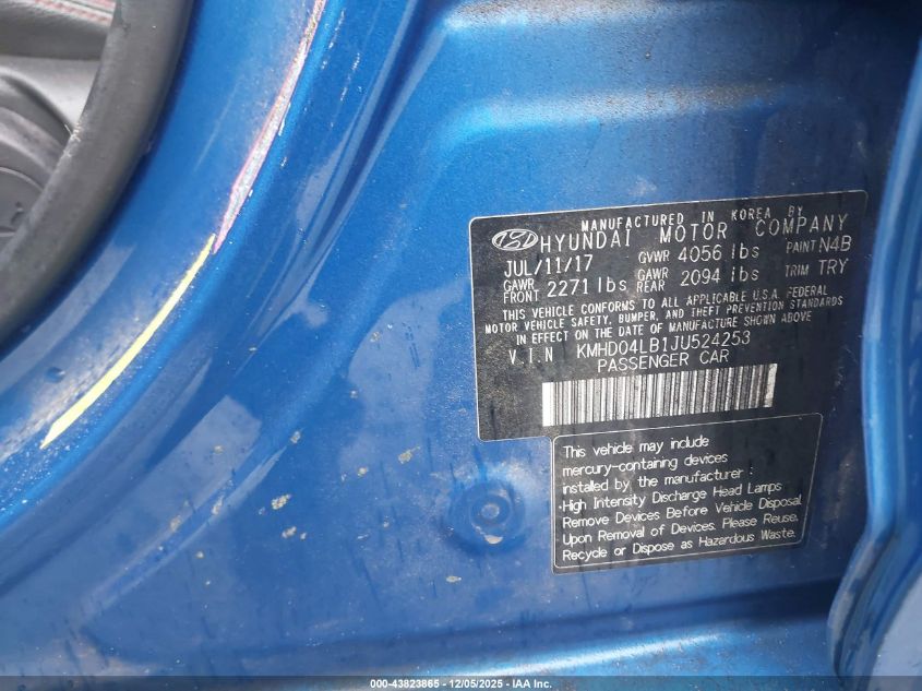 2018 HYUNDAI ELANTRA 2018 року Бензин, 1.6, Передний привод, vin - KMHD04LB1JU524253 из США