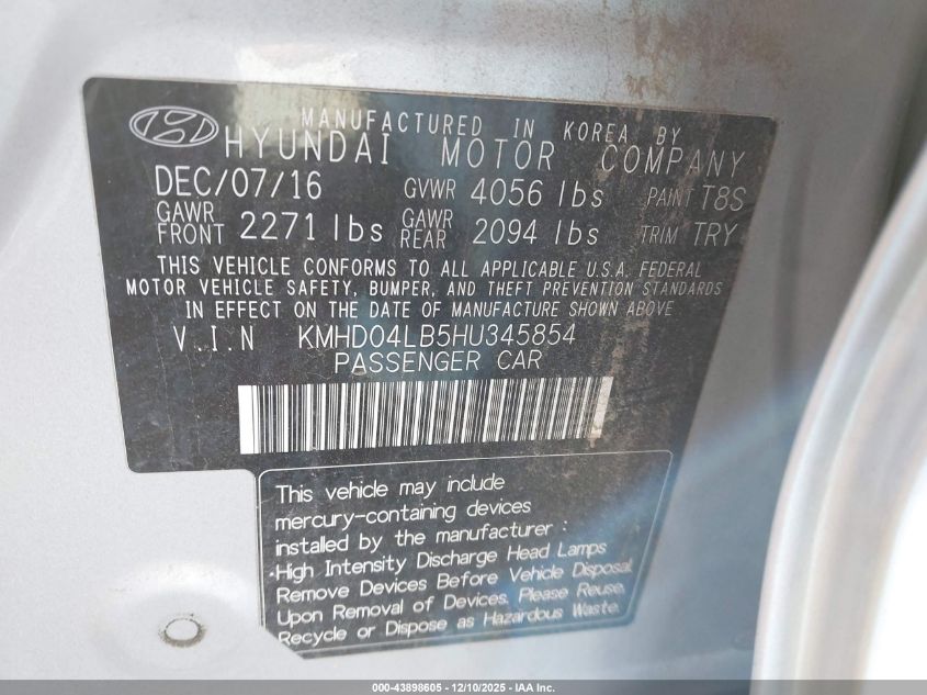 2017 HYUNDAI ELANTRA 2017 року Бензин, 1.6, Передний привод, vin - KMHD04LB5HU345854 из США