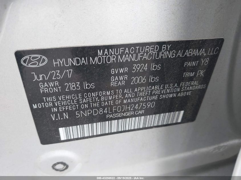 Цвет СеребряныйЦилиндры 4Привод Передний приводVIN 5NPD84LF0JH247590Состояние СтационарноПовреждения Передняя или задняяДата аукциона 2025-12-10 AutoRIA