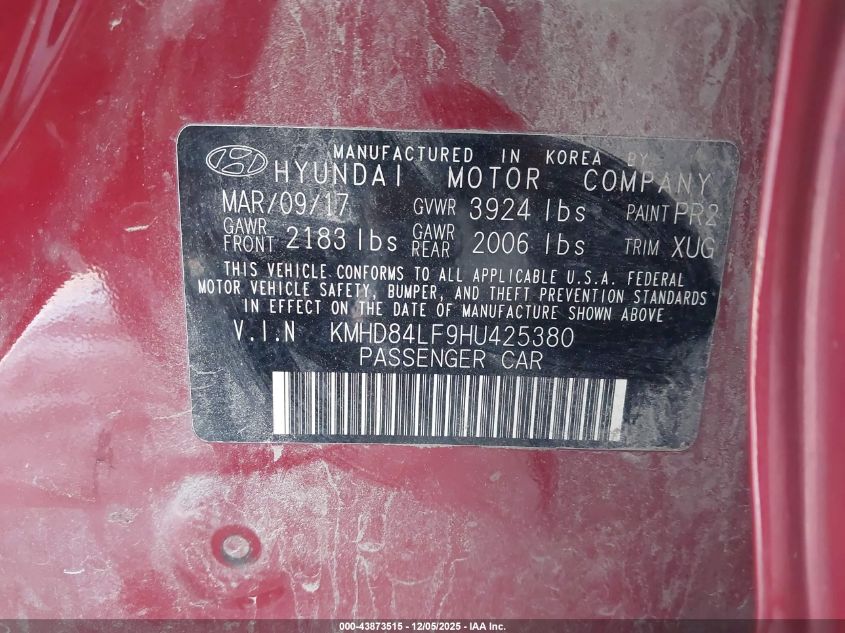 2017 HYUNDAI ELANTRA 2017 року Бензин, 2.0, Передний привод, vin - KMHD84LF9HU425380 из США