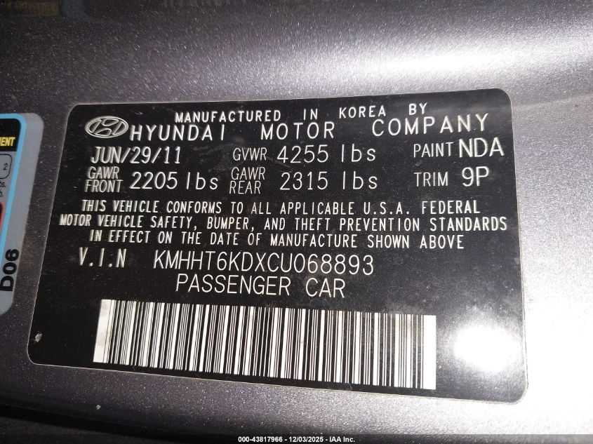 2012 HYUNDAI GENESIS 2012 року Бензин, 2.0, Задний привод, vin - KMHHT6KDXCU068893 из США