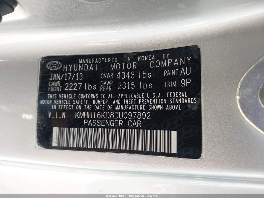2013 HYUNDAI GENESIS 2013 року Бензин, 2.0, Задний привод, vin - KMHHT6KD8DU097892 из США