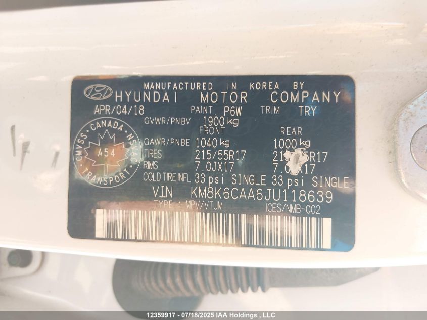 2018 HYUNDAI KONA 2018 року Бензин, , Полный привод, vin - KM8K6CAA6JU118639 из США