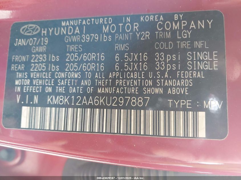 2019 HYUNDAI KONA 2019 року Бензин, 2.0, Передний привод, vin - KM8K12AA6KU297887 из США