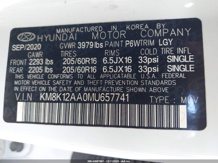 2021 HYUNDAI KONA 2021 року Бензин, 2.0, Передний привод, vin - KM8K12AA0MU657741 из США