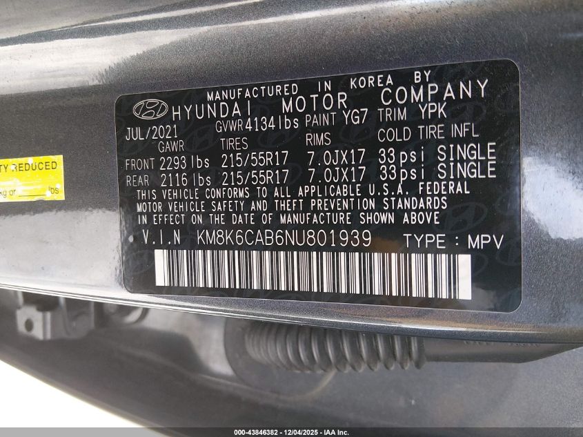 2022 HYUNDAI KONA 2022 року Бензин, 2.0, Полный привод, vin - KM8K6CAB6NU801939 из США