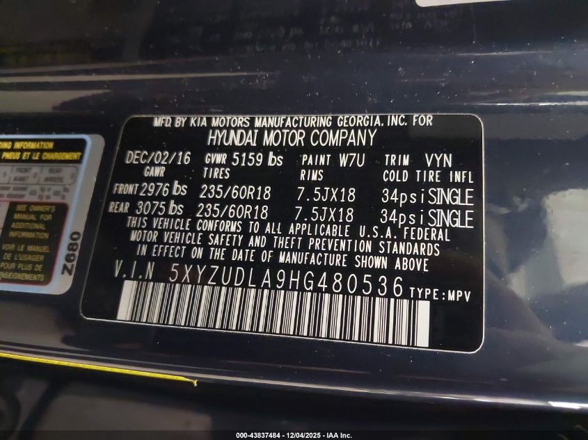 2017 HYUNDAI SANTA FE 2017 року Бензин, 2.0, Полный привод, vin - 5XYZUDLA9HG480536 из США