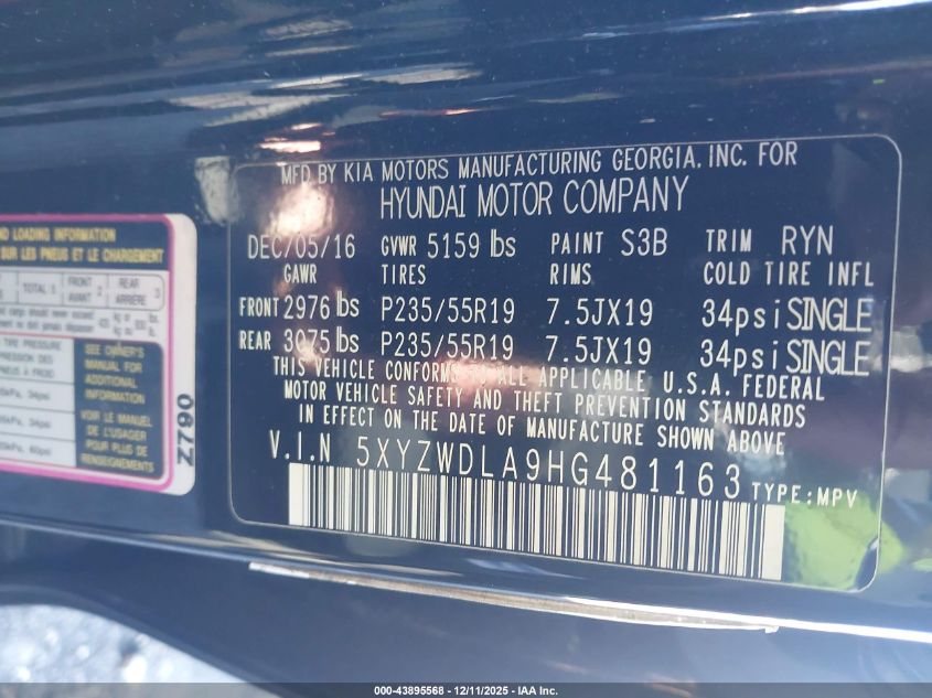 2017 HYUNDAI SANTA FE 2017 року Бензин, 2.0, Полный привод, vin - 5XYZWDLA9HG481163 из США