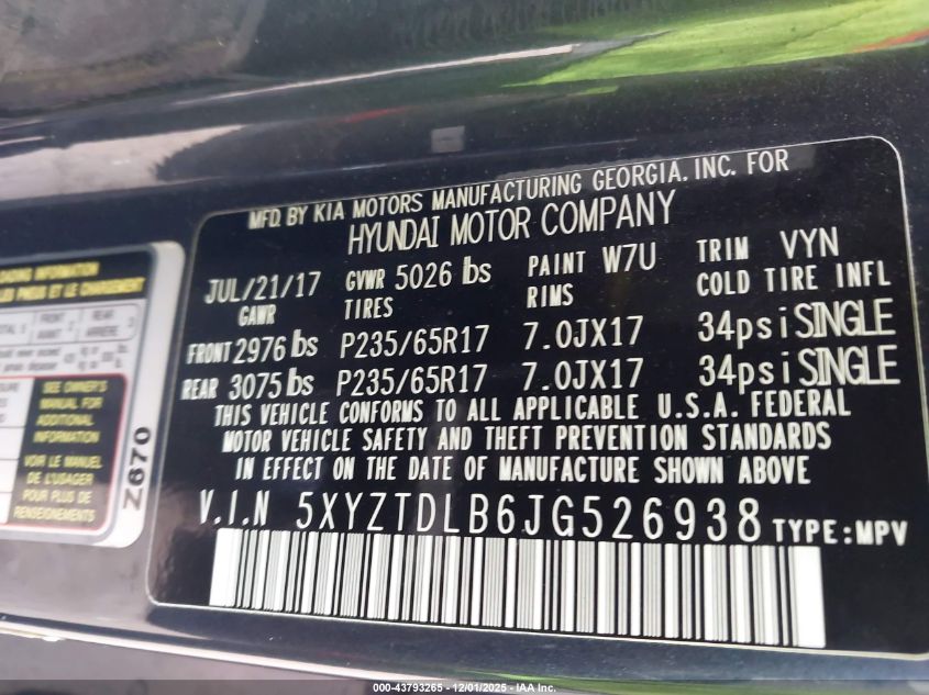 2018 HYUNDAI SANTA FE 2018 року Бензин, 2.4, Полный привод, vin - 5XYZTDLB6JG526938 из США