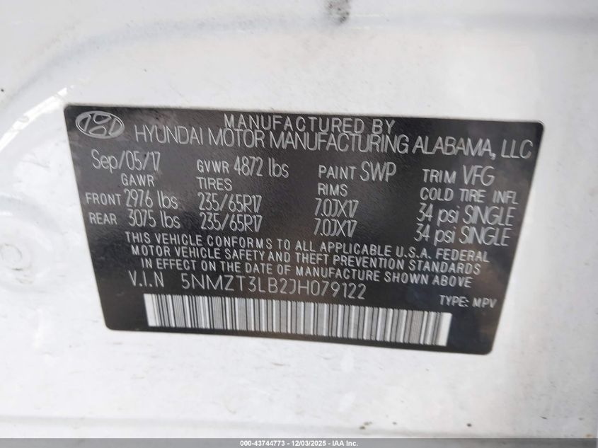 2018 HYUNDAI SANTA FE 2018 року Бензин, 2.4, Передний привод, vin - 5NMZT3LB2JH079122 из США