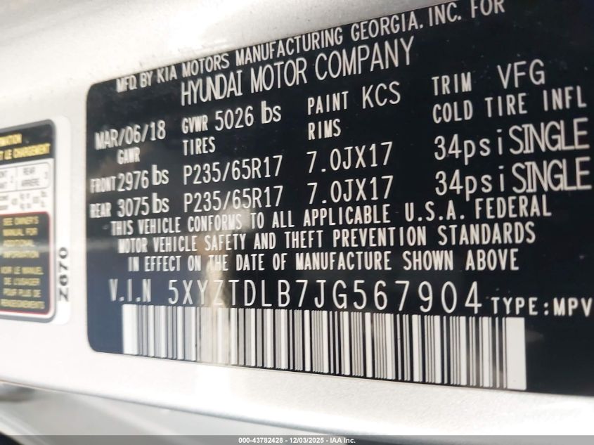 2018 HYUNDAI SANTA FE 2018 року Бензин, 2.4, Полный привод, vin - 5XYZTDLB7JG567904 из США