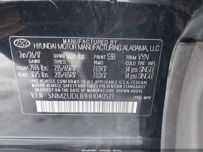2017 HYUNDAI SANTA FE 2017 року Бензин, 2.4, Полный привод, vin - 5NMZUDLB1HH040521 из США