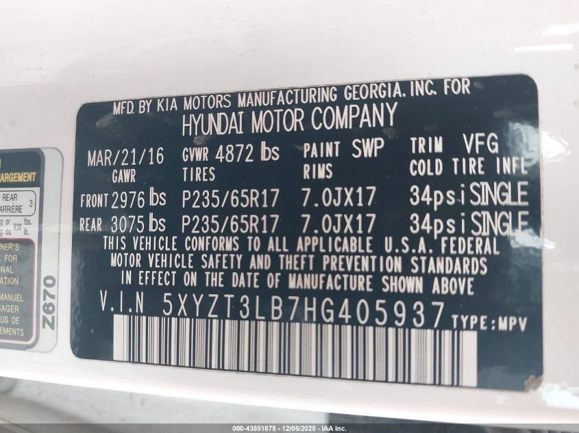 2017 HYUNDAI SANTA FE 2017 року Бензин, 2.4, Передний привод, vin - 5XYZT3LB7HG405937 из США