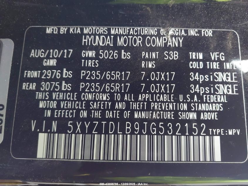 2018 HYUNDAI SANTA FE 2018 року Бензин, 2.4, Полный привод, vin - 5XYZTDLB9JG532152 из США