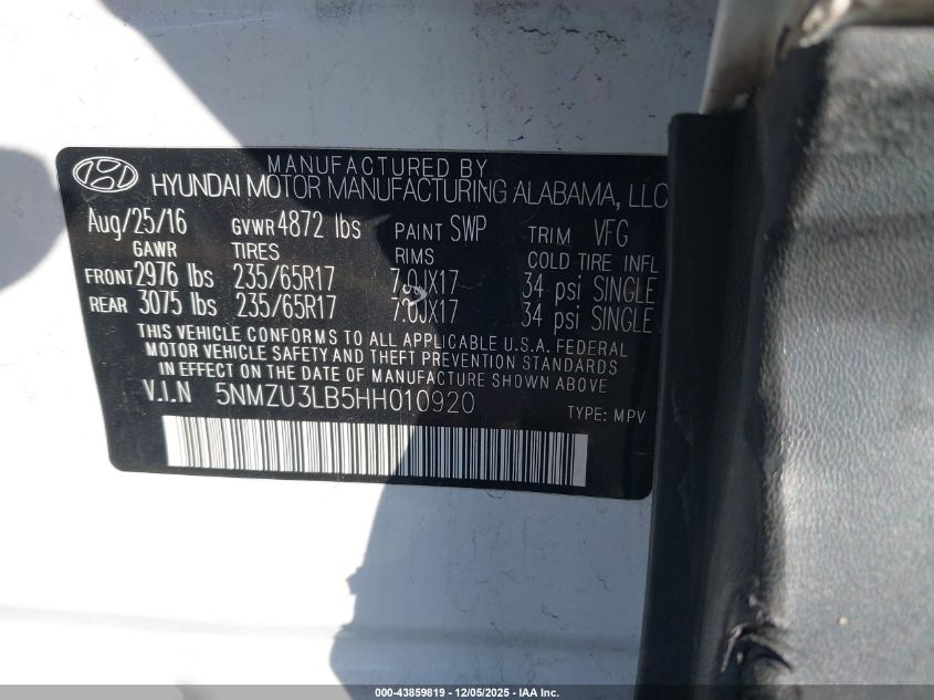 2017 HYUNDAI SANTA FE 2017 року Бензин, 2.4, Передний привод, vin - 5NMZU3LB5HH010920 из США