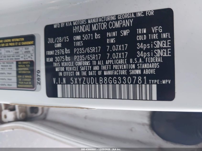 2016 HYUNDAI SANTA FE 2016 року Бензин, 2.4, Полный привод, vin - 5XYZUDLB8GG330781 из США