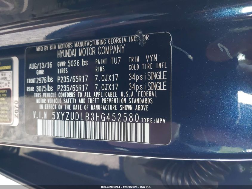 2017 HYUNDAI SANTA FE 2017 року Бензин, 2.4, Полный привод, vin - 5XYZUDLB3HG452580 из США