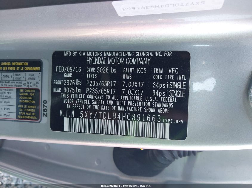 2017 HYUNDAI SANTA FE 2017 року Бензин, 2.4, Полный привод, vin - 5XYZTDLB4HG391663 из США