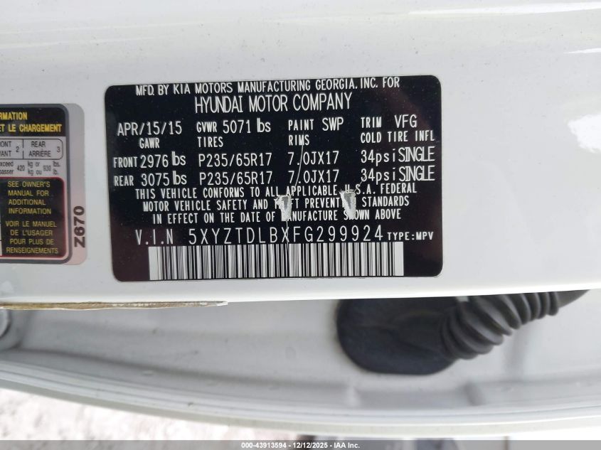 2015 HYUNDAI SANTA FE 2015 року Бензин, 2.4, Полный привод, vin - 5XYZTDLBXFG299924 из США